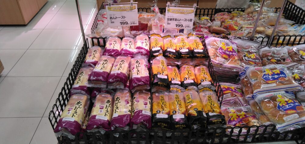 みしまや田和山店日配コーナーです!本日のおすすめはあんトースト、安納芋トーストでございます!食べやすい大きさのトーストが六枚入り!ぜひお買い求めくださいませ!