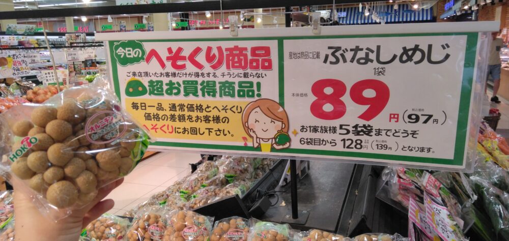 こんにちは、みしまや田和山店・青果からのおすすめは【ぶなしめじ】です。和食から洋食まで使える万能きのこ!をぜひ田和山店にてお買い求めくださいませ。