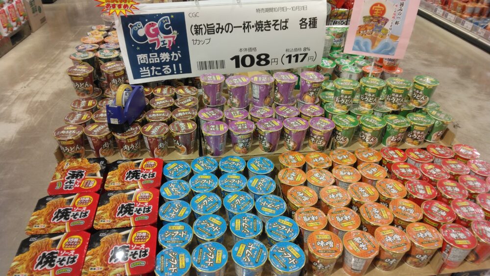 こんにちはみしまや学園店です。今月は、CGCフェア商品が盛りだくさんです。 食品からは日清xCGCの共同開発商品、旨みの一杯カップ麺です。ぜひこの機会にお買い求め頂きお試し下さい。ご来店お待ちしております。