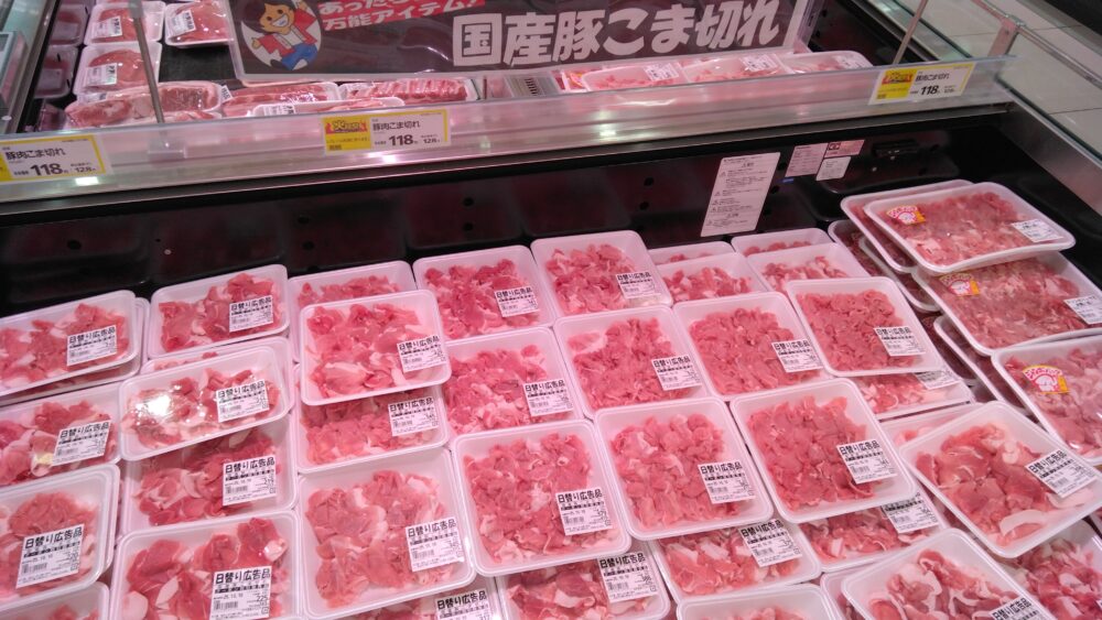 本日みしまや東川津店精肉コーナーからのおすすめは、国産豚こま切れが100g118円(税込価格128円)と、お買い得となっております!お買い求め安くなってきました!是非便利な豚こまお買い求めくださいませ♪本日もみしまや東川津店へのお越しをお待ちしております!