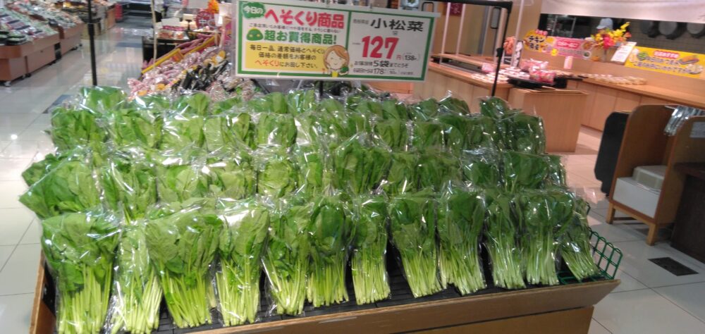 こんにちは、田和山店農産部門です。本日のおすすめは小松菜です!スパゲッティや野菜炒めにいかがでしょうか。ぜひお買い求めくださいませ。
