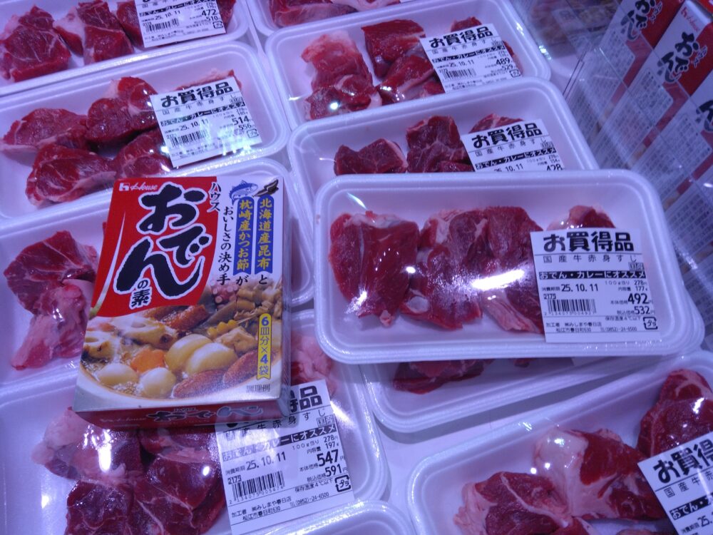 春日店です。本日のおすすめ品は国産牛肉赤身スジです。最近夜冷えてきましたね。そろそろおでんが食べたくないですか?他にもカレー、ビーフシチューにもおすすめです。本日100グラム当たり278円にて販売しております。是非お買い求めくださいませ。