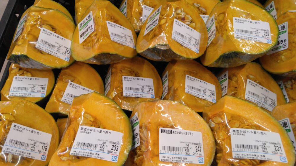 当店野菜コーナーでは甘さが自慢の北海道産昔の大地栗吉かぼちゃを販売いたしております。どうぞお立ち寄りお買い求めくださいませ。