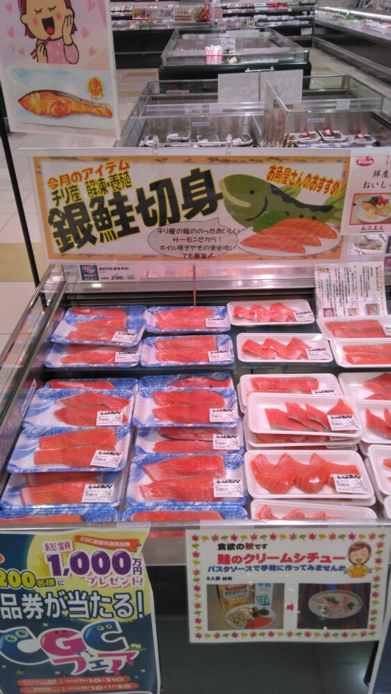 こんにちは!みしまや東川津鮮魚コーナーです!今月はCGCフェア開催中!鮮魚コーナーでは鮭をはじめとしたおすすめ商品がたくさん!なかでも銀鮭は用途たくさんで一番のおすすめです!ぜひお買い求めくださいませ!