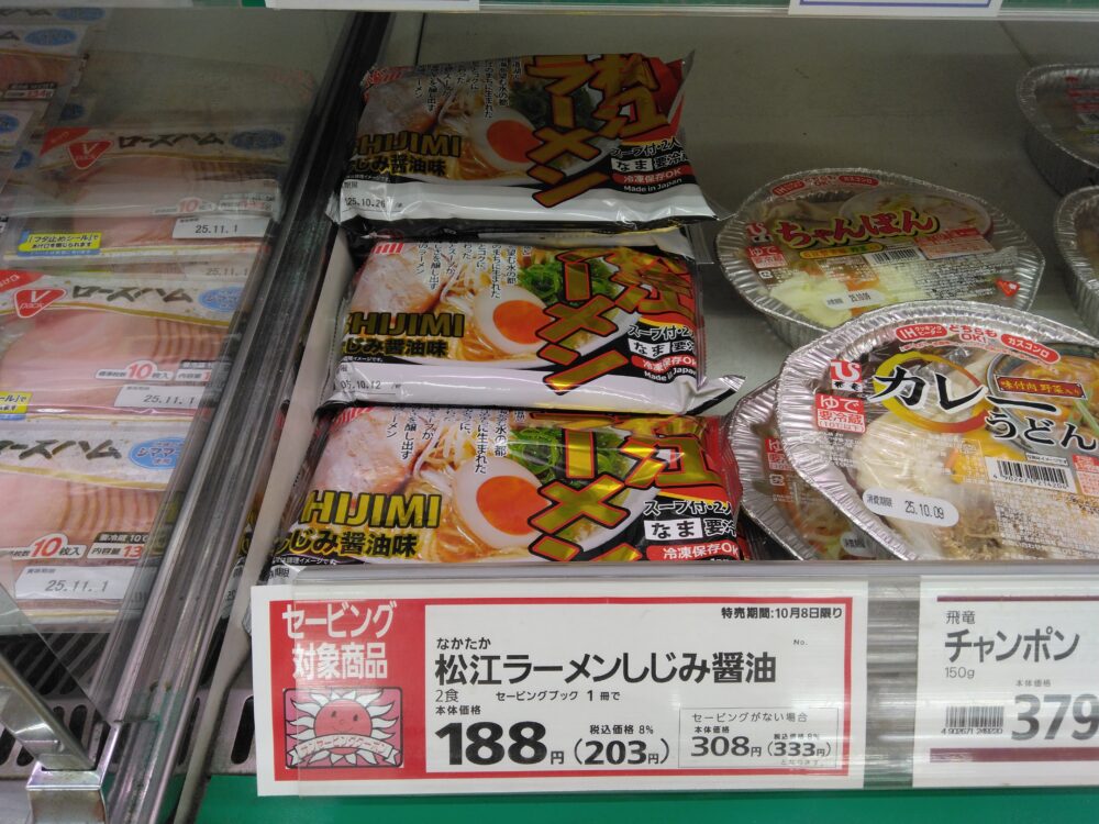 こんにちは、八束店です!今日はセービングで松江ラーメンがお買い得です。夜は肌寒い日が増えてきました。今日の夕食は熱々ラーメンにしませんか??是非お買い求めくださいませ。