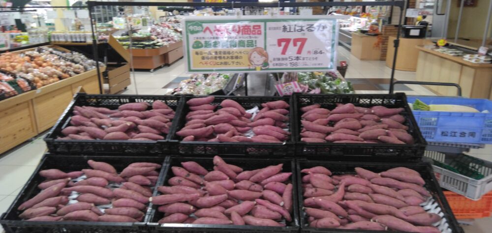 こんにちは、田和山店農産部門です。本日のおすすめは紅はるか1本です!焼き芋やお味噌汁にいかがでしょうか。ぜひお買い求めくださいませ。