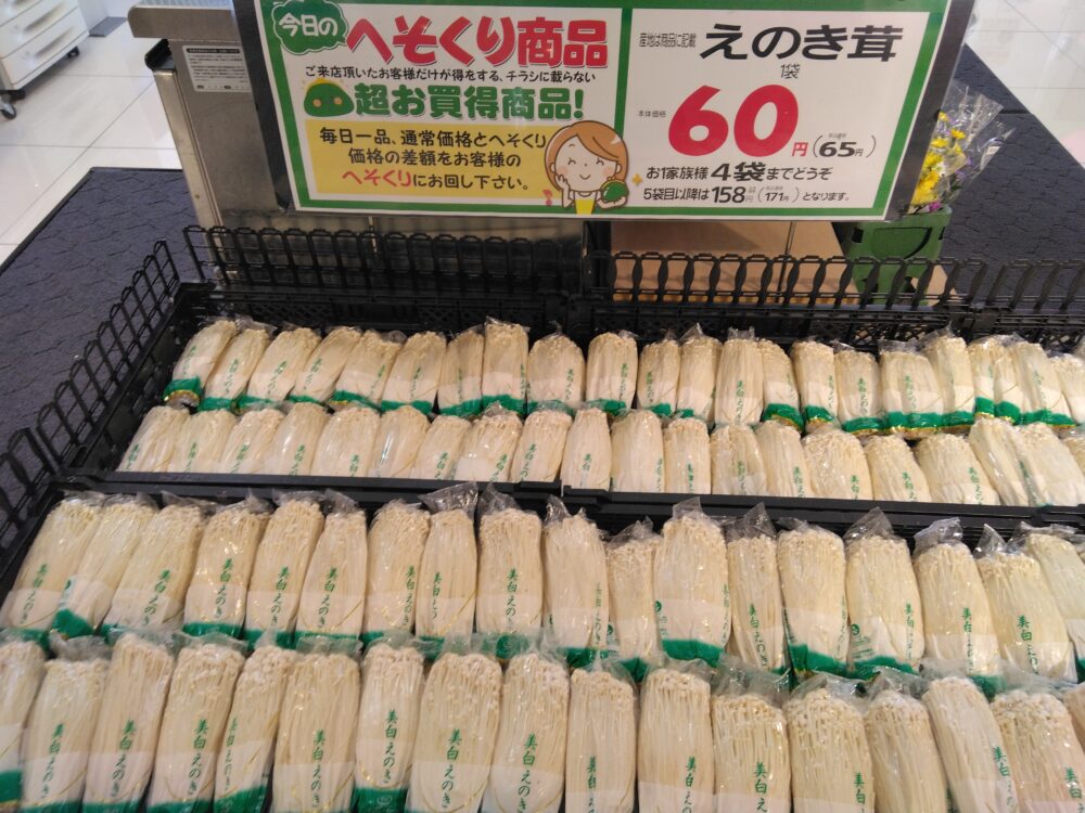 本日のおすすめはえのきです!炒めものや鍋がおすすめです!ぜひお買い求め下さいませ!