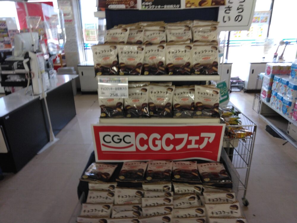 こんにちは八束店です。今日はCGCチョコクッキーをおすすめします。クッキーの周りをチョコレートで包んだサクサク感抜群のお菓子です。コーヒーと一緒にどうそ!