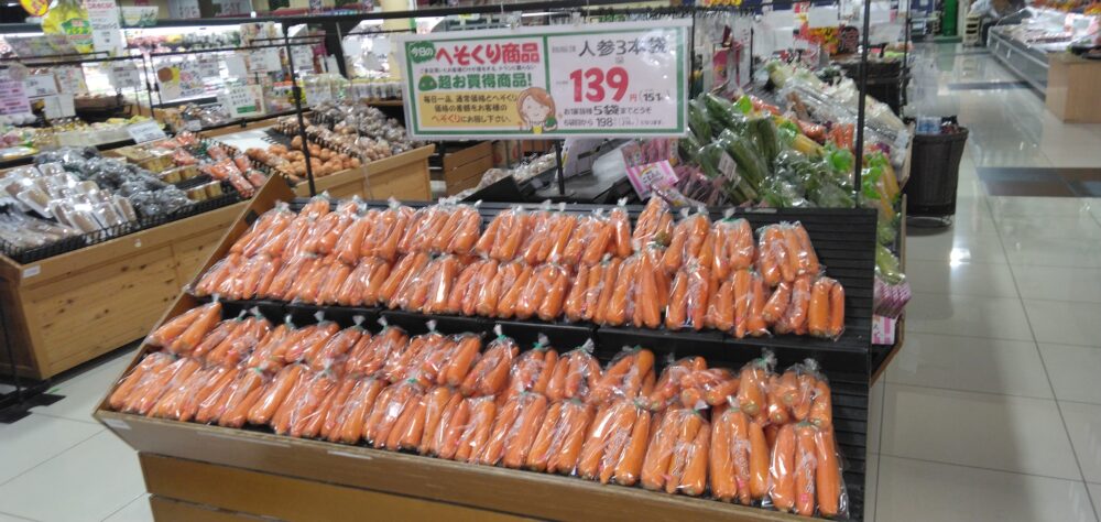 こんにちは、田和山店農産部門です。本日のおすすめは人参3本入りです!広告の品よりお買い得でございます!カレーライスやサラダにいかがでしょうか。ぜひお買い求めくださいませ。