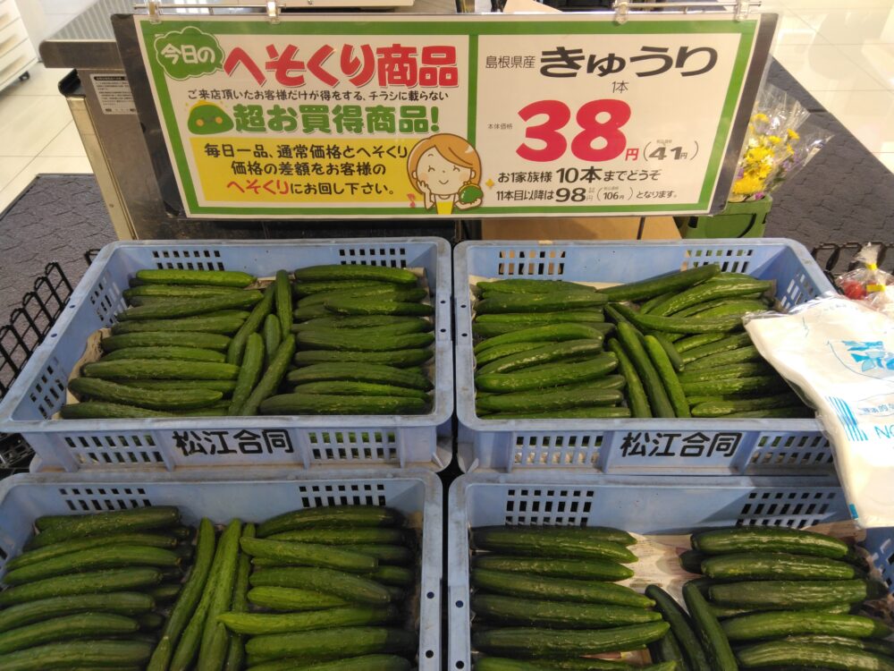 こんにちはみしまや雲南三刀屋店です。 本日のへそくりはきゅうりです。 なんだか昼間がまた暑くなってしまいました。 あっさりサラダに入れてみませんか。 ぜひお買い求め下さいませ!