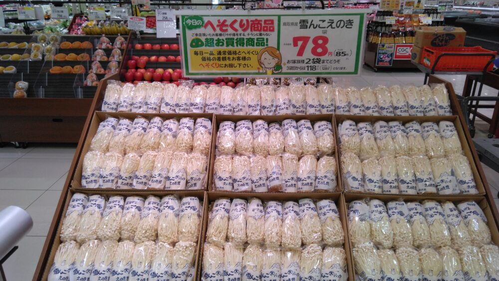 東川津店本日のへそくり商品はえのきです。お鍋や炒め物などに!