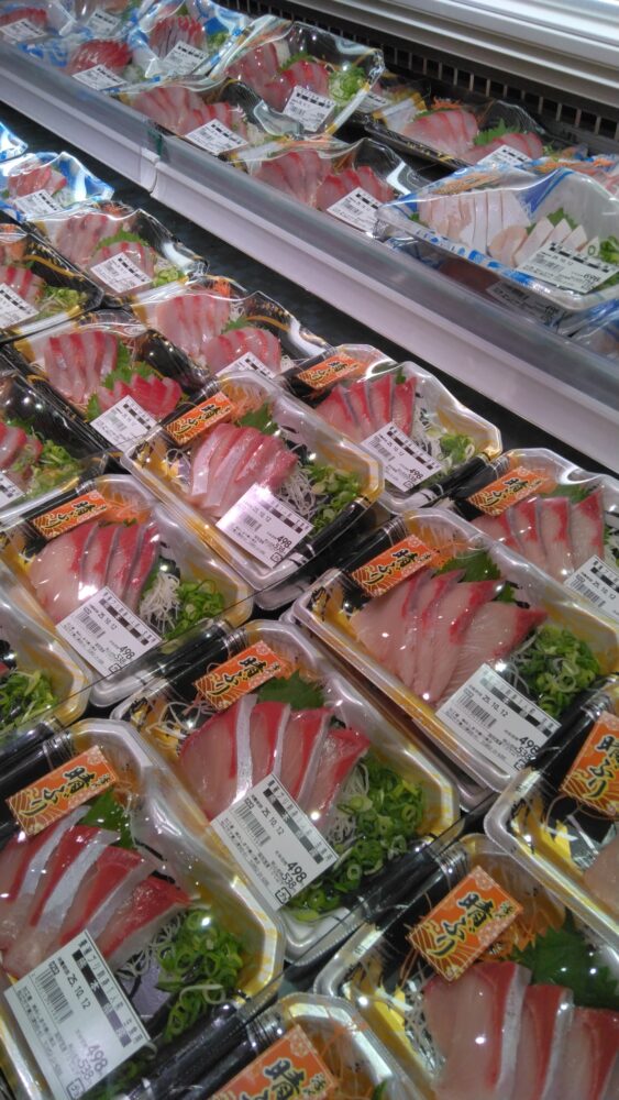 こんにちは!みしまや東川津鮮魚コーナーです!本日は週末のご馳走としてお刺身はいかがでしょうか?地物のネタ満載の売場からお好きなものをお選び下さい!お待ちしております!