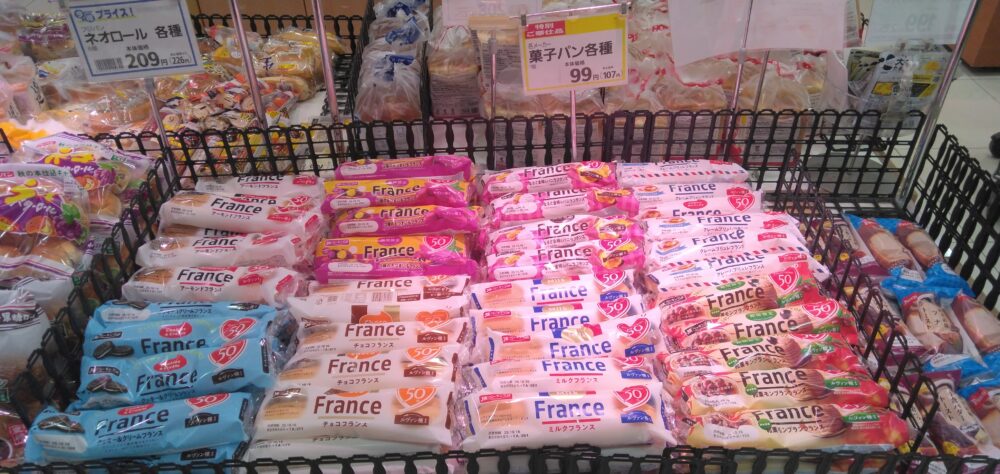 みしまや田和山店日配コーナーです!本日のおすすめはフランスパン各種でございます!大人気のミルクフランスを含む各種をお買い得価格で販売中!ぜひお買い求めくださいませ!