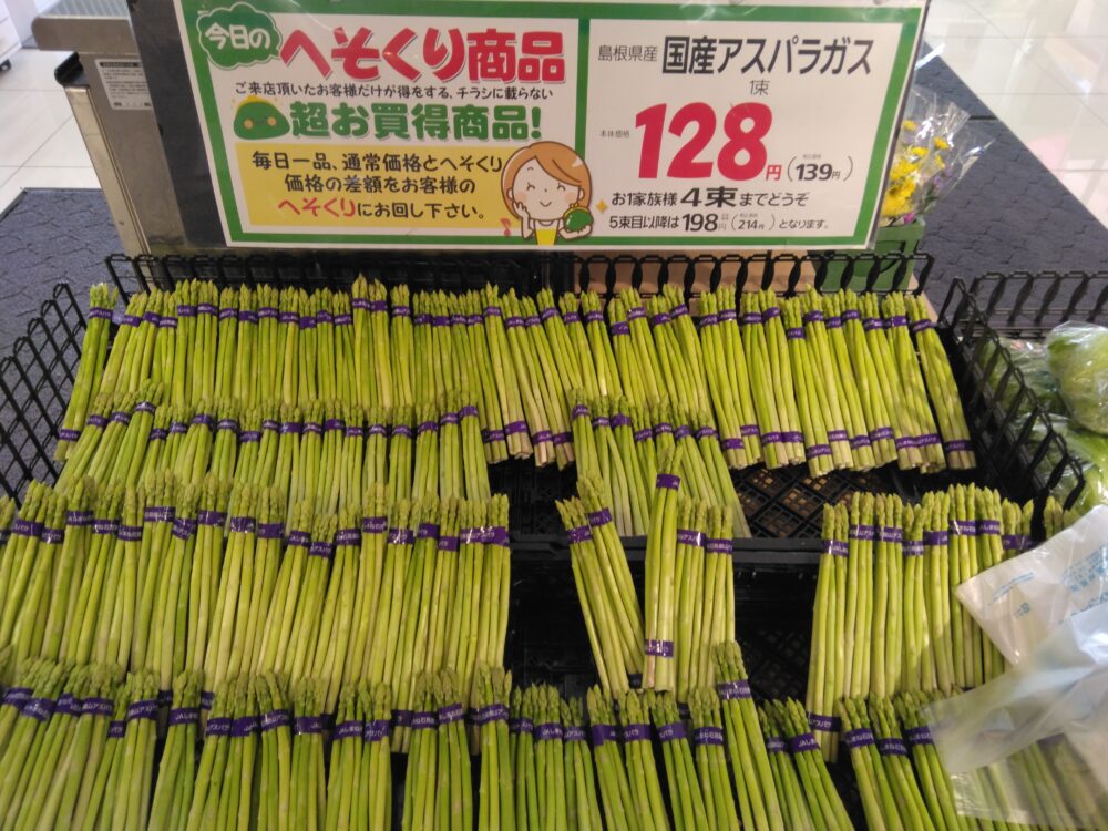こんにちはみしまや雲南三刀屋店です。 本日のへそくりはアスパラガスです。 当店の大人気商品です。 毎度すぐに売り切れてしまいますので、ぜひお早めにお買い求め下さい!