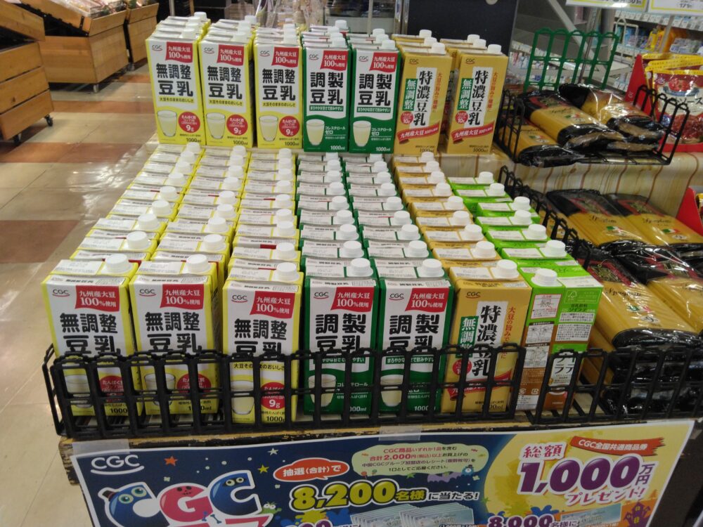 こんにちは中原店です。日配コーナーからのおすすめ商品はCGCの豆乳です。九州産大豆を使用した調整豆乳、無調整豆乳、特濃無調整豆乳、ソイラテと各種お買い得となっております。是非お買い求めくださいませ。