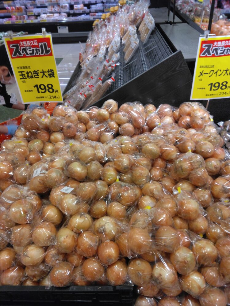 本日は玉ねぎがお買い得です。かき揚げや炒め物、オニオンスープやオニオンフライ、カレーやシチューの具などにどうぞ。
