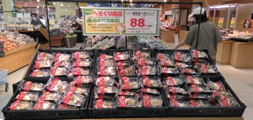 こんにちは、みしまや田和山店農産部門です。本日のおすすめは【舞茸食べきりパック】です。お手軽サイズで使いやすい舞茸です。ぜひお買い求めくださいませ。本日は火曜祭も開催中です。ご来店お待ちしております。