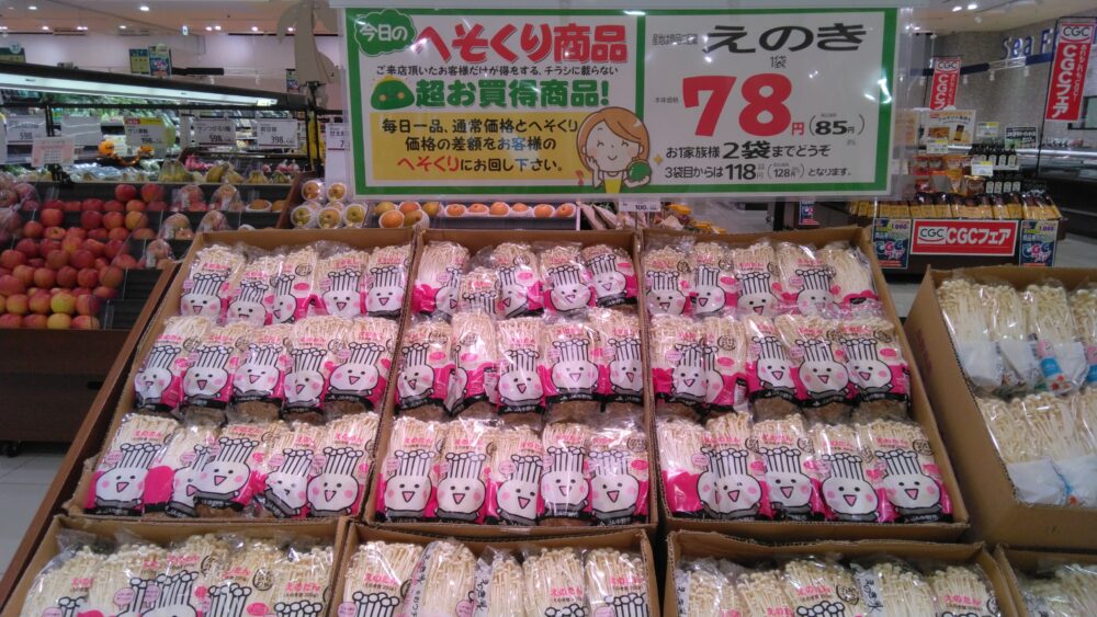 東川津店、本日のへそくりはえのきです! 栄養たっぷりきのこパスタがおすすめ♪ この機会に是非お買い求めくださいませ!