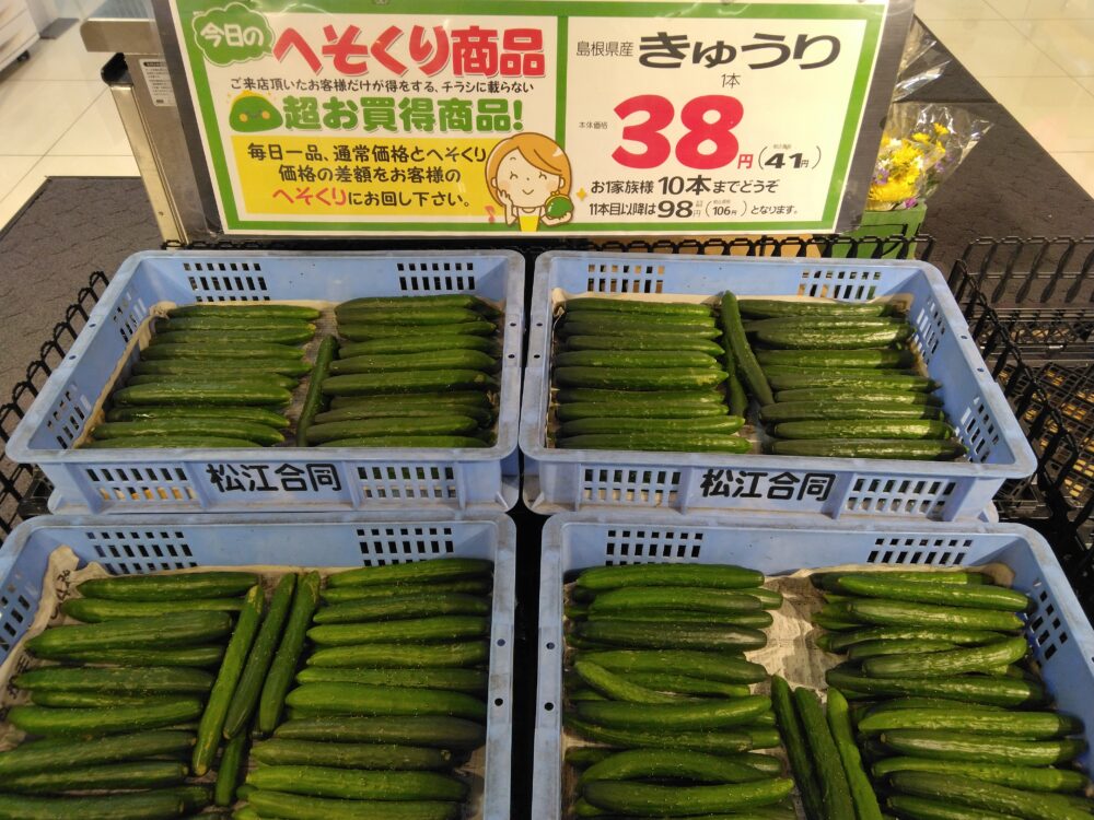 こんにちはみしまや雲南三刀屋店です。 本日のへそくりはきゅうりです。 ぜひお早めにお買い求め下さいませ!