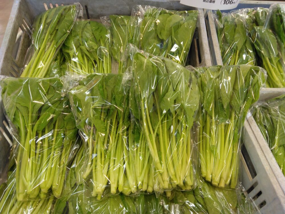 こんにちは。今日の農産コーナーからのおすすめ商品は小松菜です。炒め物、和え物、汁物とその他いろいろと使えて便利です。是非お買い求めくださいませ。