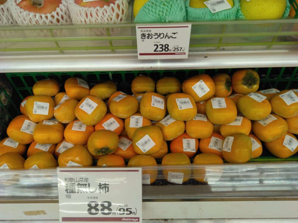 本日のおすすめは、和歌山県産の種無し柿をおすすめします、種が無く甘いです。ぜひお買い求めくださいませ。