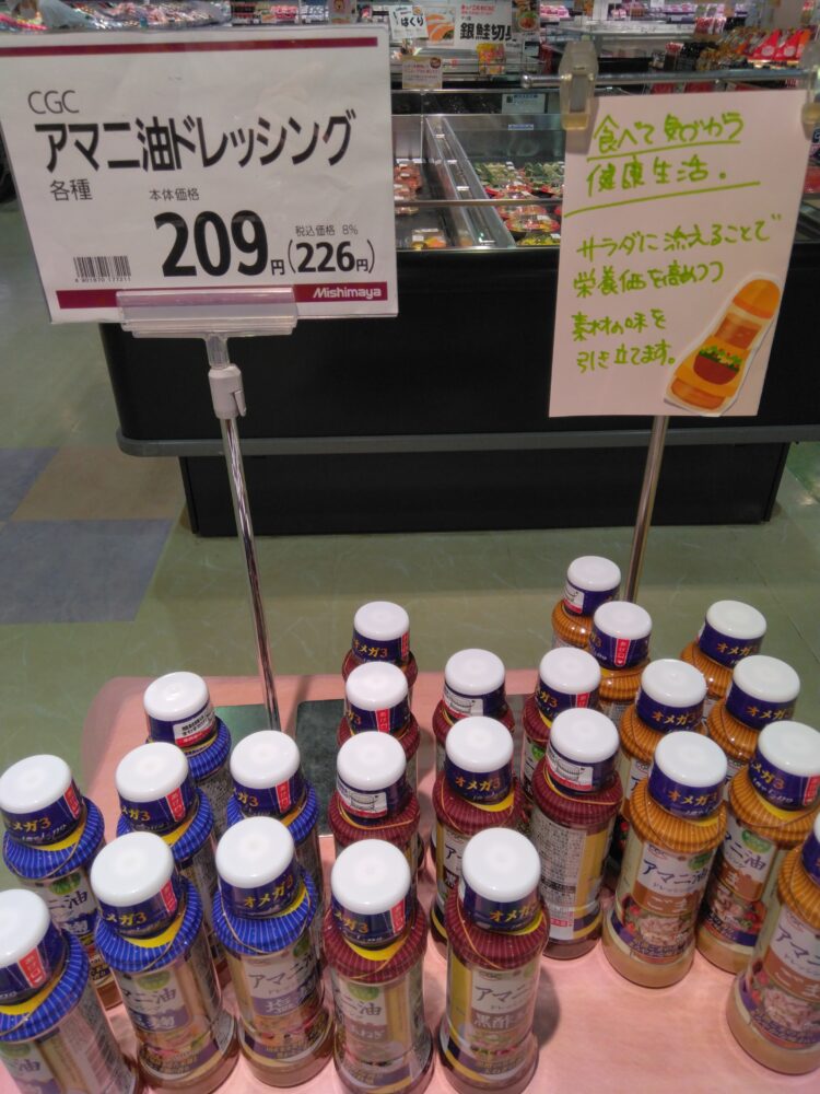 おはようございます! 上の木店です。 今日のおすすめ商品は、 買いやすい値段でお客様から大好評の CGCアマニ油ドレッシングです! 本日もお客様のご来店お待ちしております。