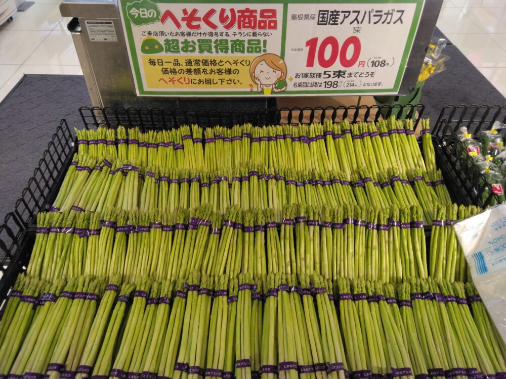 本日のおすすめはアスパラガスです!ベーコンや豚バラ肉で肉巻きがおすすめです!ぜひお買い求め下さいませ!