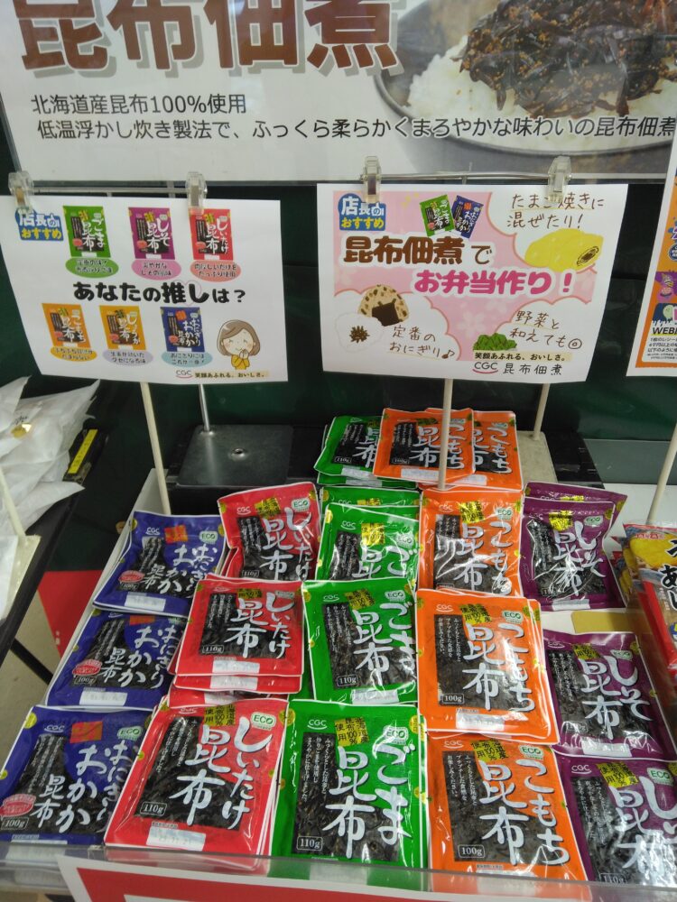 本日のおすすめは、CGCの昆布の佃煮です。 おすすめポイントは種類の多さと使いやすさです! ご飯にももちろん合いますが、卵焼きやきゅうりなどの野菜と和えてもとってもおいしいです(^^) お弁当にもってこいの商品、ぜひお買い求め下さいませ。