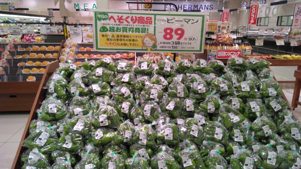 東川津店、本日のへそくりはピーマンです! 肉詰めがおすすめ♪ この機会に是非お買い求めくださいませ!