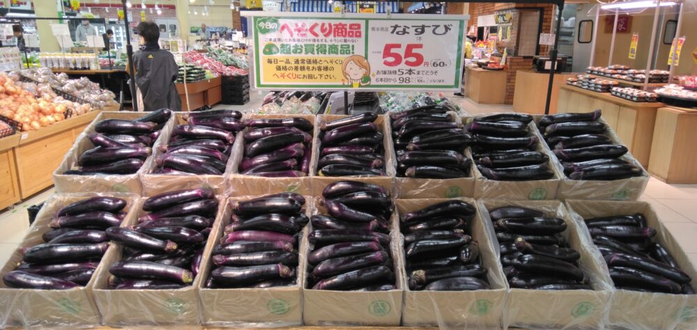 こんにちは、みしまや田和山店農産部門です。本日のおすすめは、【なすび】です。様々な料理ご利用いただける一品です。担当者のおすすめは、なすの素揚げです。カレーと一緒にいかがでしょうか。ぜひお買い求めくださいませ。