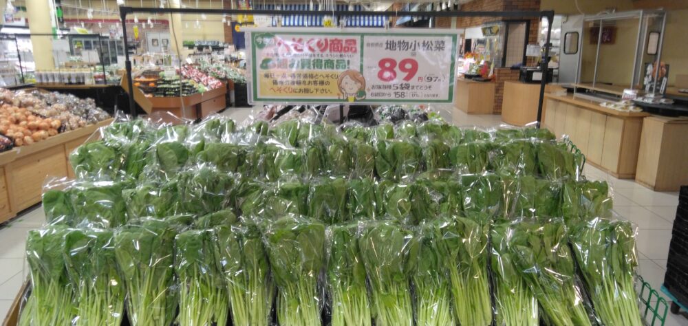 こんにちは、みしまや田和山店農産部門です。本日のおすすめは、【地物小松菜】です。島根県産の小松菜がお買い得となっております。ぜひお買い求めくださいませ。