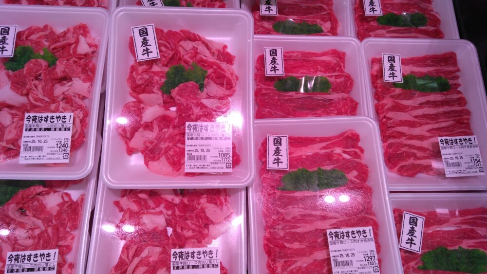 本日みしまや東川津店精肉コーナーからのおすすめは、国産牛肩ロースすき焼き用が100g598円(税込価格646円)合わせて使い勝手の良い切り落としが498円(税込価格538円)と、お買い得となっております!是非お買い求めくださいませ。本日もみしまや東川津店へのお越しをお待ちしております!