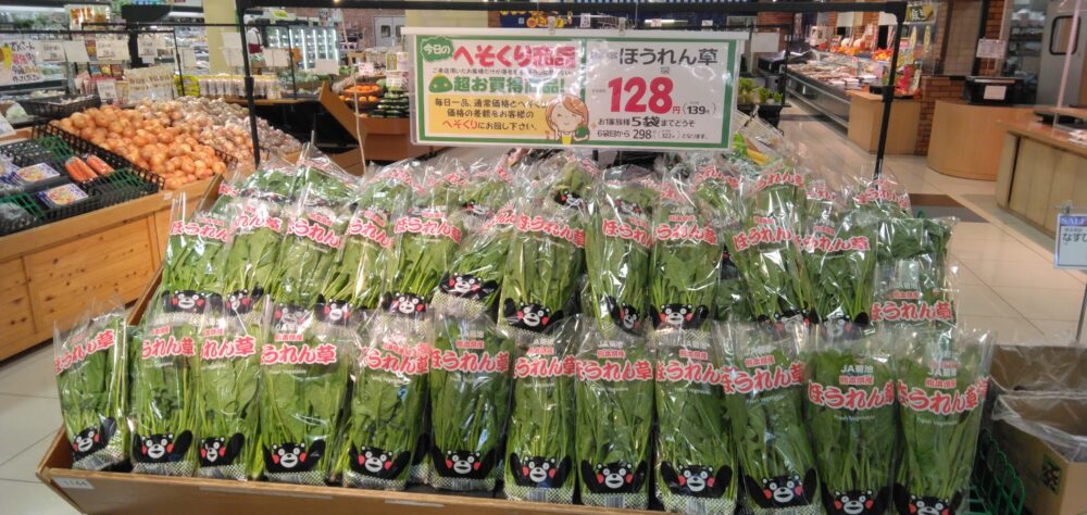 こんにちは、田和山店農産部門です。本日のおすすめはほうれん草です!今日限りで通常の半額以上と大変お買い得となっております!ぜひお買い求めくださいませ。