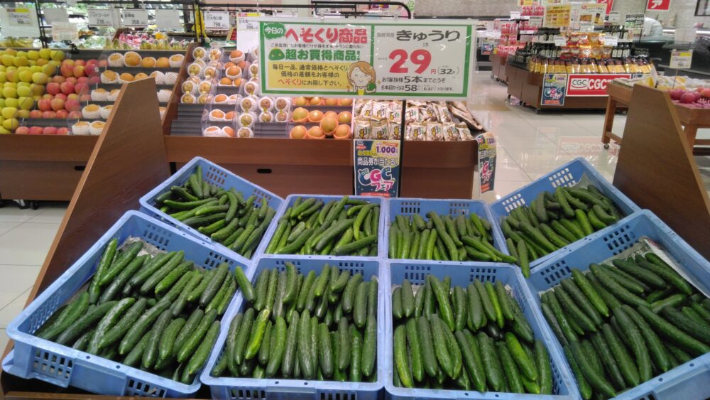 東川津店、本日のへそくりはきゅうりです! やみつききゅうりがおすすめ♪ この機会に是非お買い求めくださいませ!