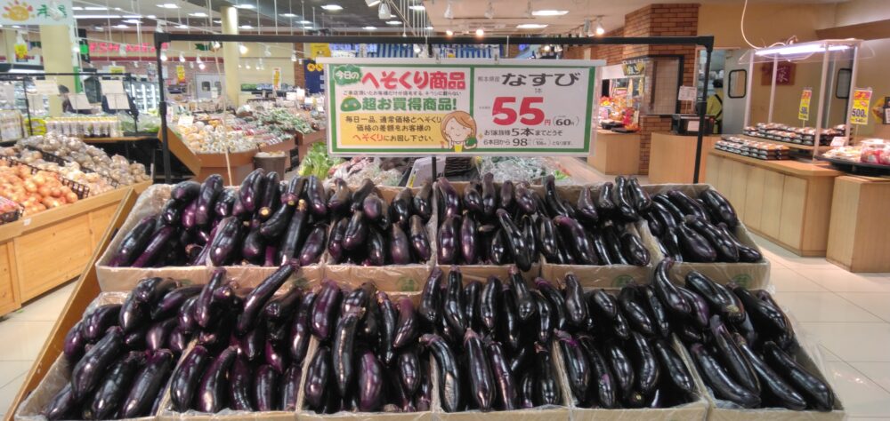 こんにちは、みしまや田和山店農産部門です。本日のおすすめは【なすび】です。煮浸しや味噌汁の具材にいかがでしょうか。ぜひお買い求めくださいませ。