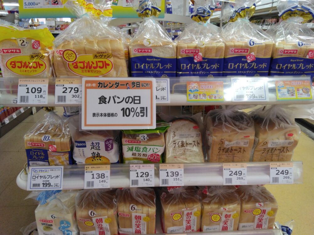 本日は、食パンを表示本体価格から10%で販売いたします。ぜひお買い求めくださいませ。