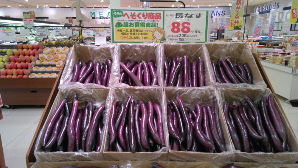 東川津店、今日のへそくりは長なすです! 炒め物やなすのステーキがおすすめ♪ この機会に是非お買い求めくださいませ!
