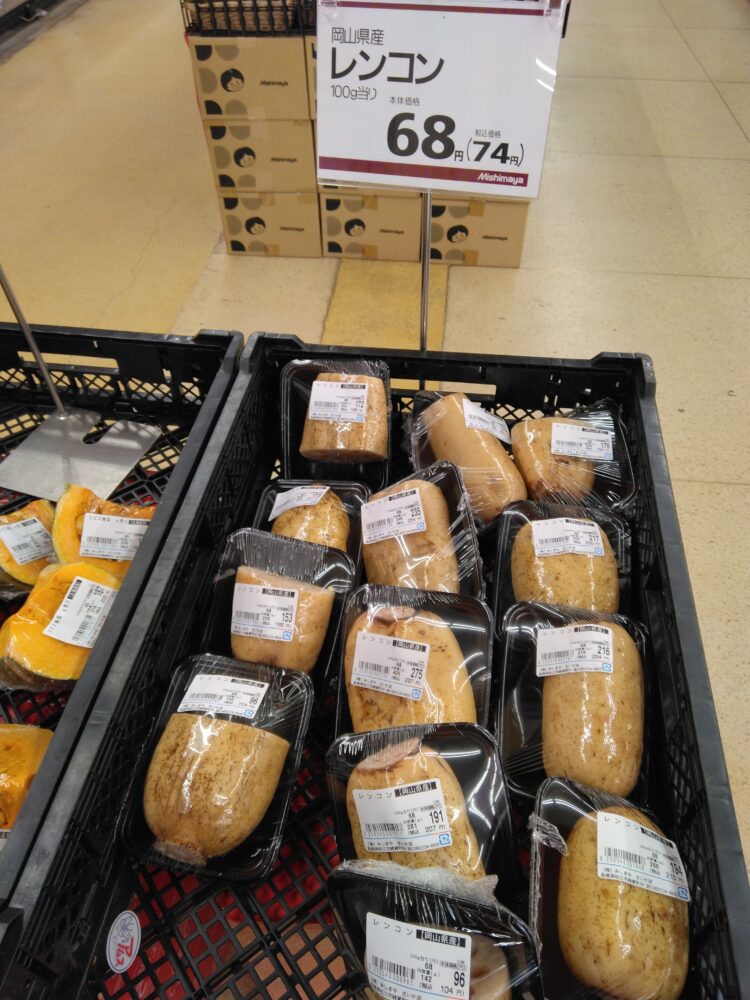 本日のおすすめは、岡山県産のレンコンです。酢の物、煮物、天ぷらなどにはいかがでしょうか、ぜひお買い求めくださいませ。