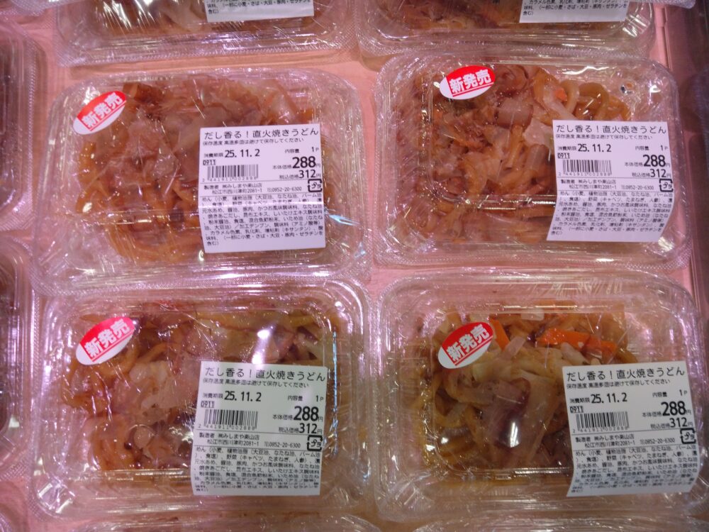 こんにちは!惣菜コーナー、さんぷくです。 ただいま直火焼うどんを数量限定で販売中です。 かつおと焼きあごだしと、なんといっても鰹節が醤油ベースのうどんに相まって、食欲そそるお味となっております。是非この機会にお買いもとめ下さいませ。ご来店お待ちしております。