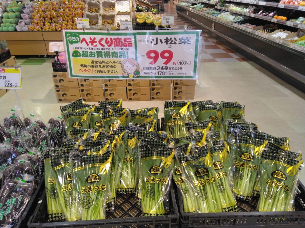 おはようございますみしまや上の木店です。本日は小松菜が本日限りでお買い得となっております。ぜひお買い求めくださいませ。