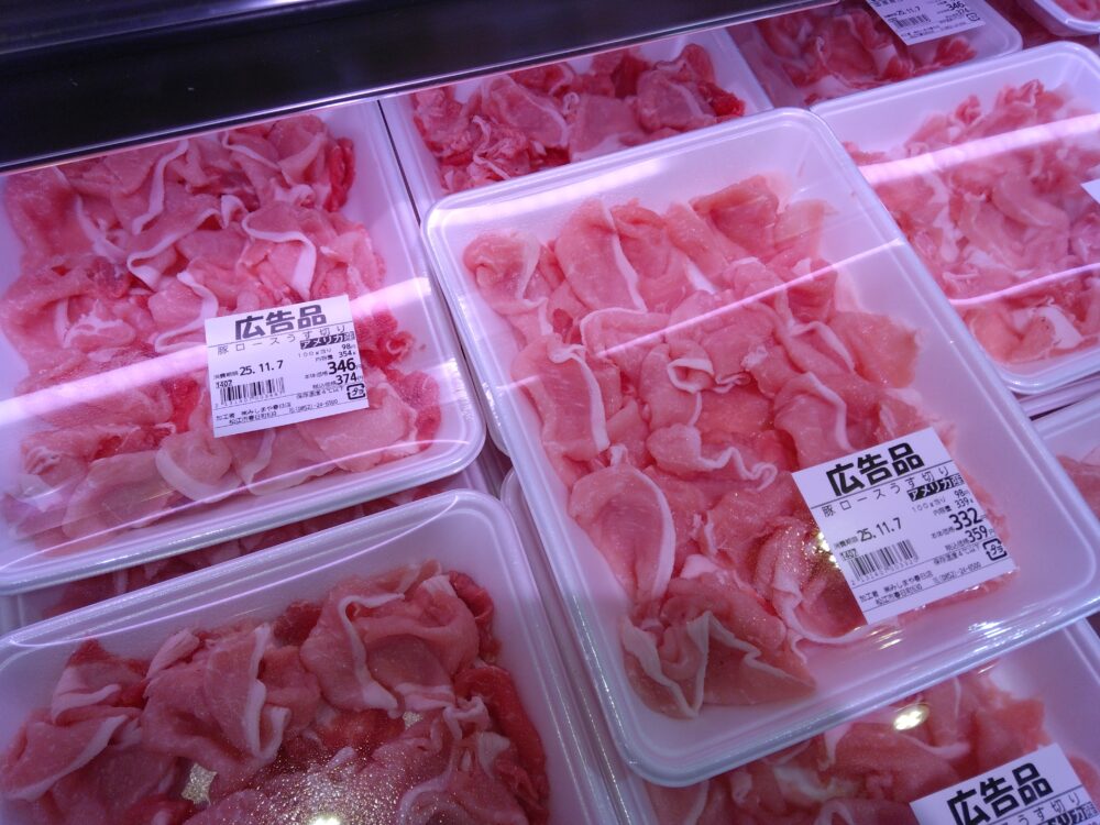 春日です。本日のおすすめ品はアメリカ産豚ロースうすぎり肉です。炒め物やお鍋におすすめですよ。100グラム当たり98円にて販売しております!ぜひお買い求めくださいませ。