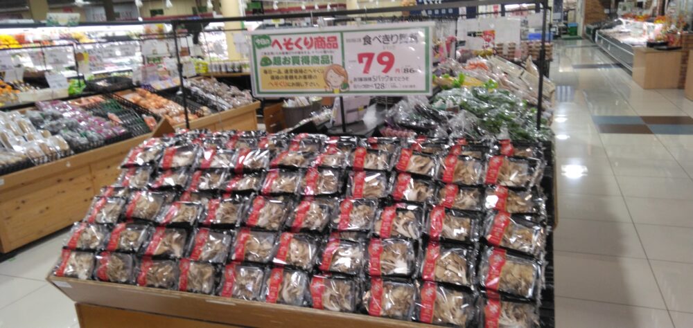 こんにちは、田和山店農産部門です。本日のおすすめは舞茸食べきりパックです!使い切りサイズでおすすめです!天ぷらやお肉と一緒に炒めてみてはいかがでしょうか。ぜひお買い求めくださいませ。