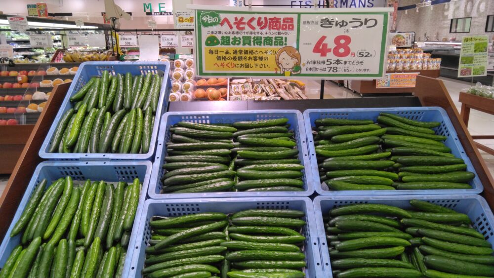 東川津店、本日のへそくりはきゅうりです! やみつききゅうりがおすすめ♪ この機会に是非お買い求めくださいませ!