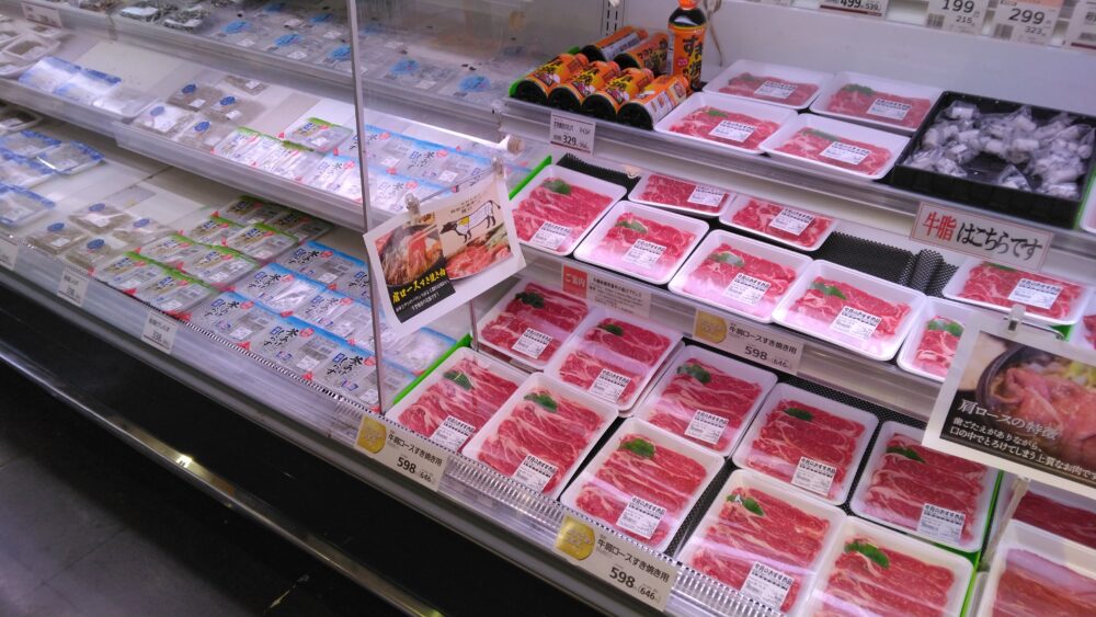 こんにちは、みしまや学園店です。今月の精肉コーナーからのおすすめ商品は、国産牛肩ロースすき焼きです。肩ロースの特徴としては、歯ごたえがありながら、口の中でとろけてしまう上質なお肉です。100g当たり本体価格598円(税込み価格646円)となっております。今夜はすき焼きは、いかがでしょうか。是非お買い求め下さい。ご来店お待ちしております。