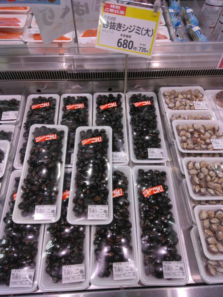 只今、北海道フェア開催中です!!鮮魚コーナーでは、花咲ガニ、栗がに、その他にも北海道産の干物各種を取り揃えております! 合わせて、本日の特別ご奉仕品といたしまして、シジミ1kgを680円で販売しております!! 是非お買い求め下さいませ!!