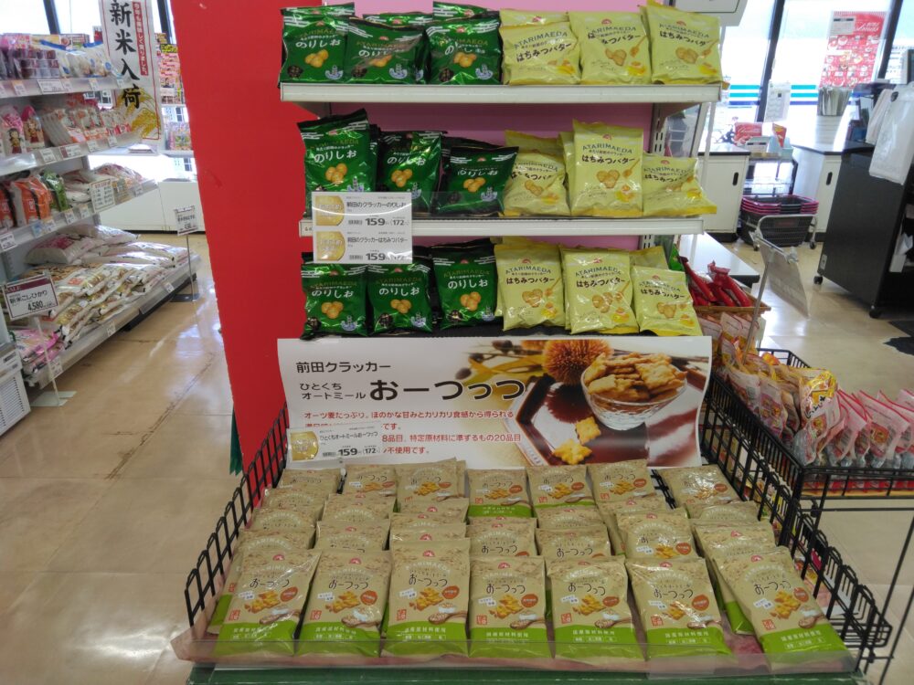 こんにちは八束店です!今日のおすすめは前田のクラッカーです。小袋なので持ち運びしやすく、手が汚れにくいのでつまみやすいです。3種類ありますので、ぜひそれぞれお試しください!
