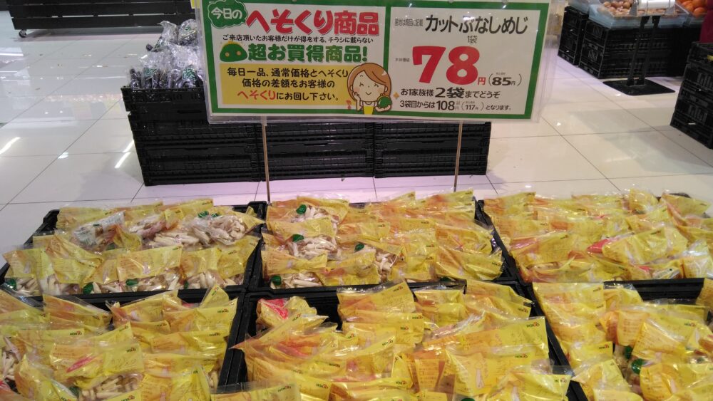 おはようございます!みしまや春日店農産コーナーです。本日のへそくり商品は三重県産カットぶなしめじです。バターや醤油で炒めたり、味噌汁に入れたり、シチューの具材にしたりと使いやすい食材です。お1家族様2袋まで1袋78円、3袋目から108円で販売しております。ぜひお買い求めくださいませ!