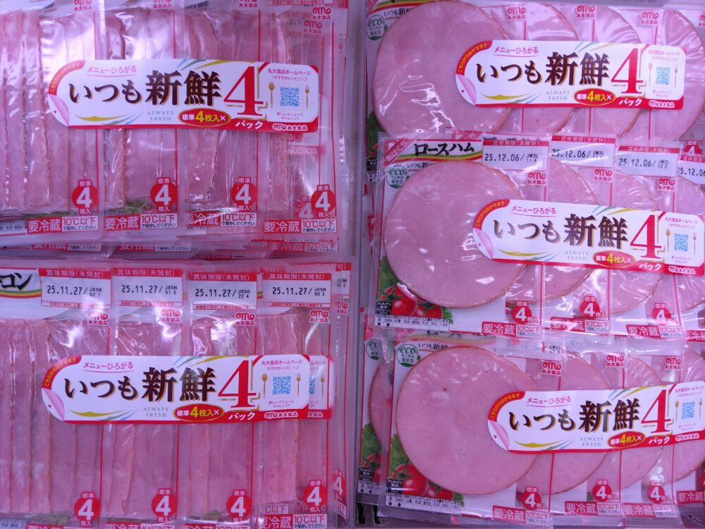 こんにちは、中央店です。本日のおすすめは、丸大食品のロースハム、ハーフベーコンです!4連なので冷蔵庫に常備しておくと便利ですよ!価格もお求めやすくなっております。また、これらを含む丸大食品の商品500円分のお買い上げレシートを送ると、クリスマスケーキプレゼントに応募することができます!ぜひ参加してみてください!