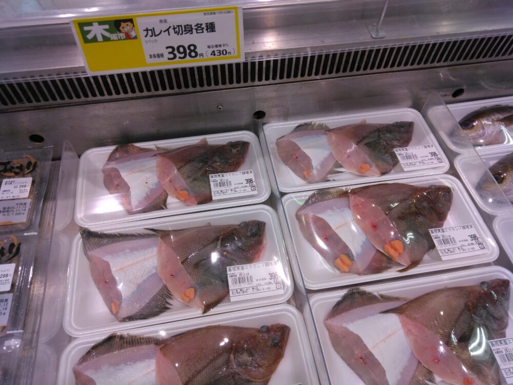 こんにちは楽山店です。今日はカレイ切り身がおすすめです。煮付けにいかがでしょうか。是非お買い求め下さいませ。
