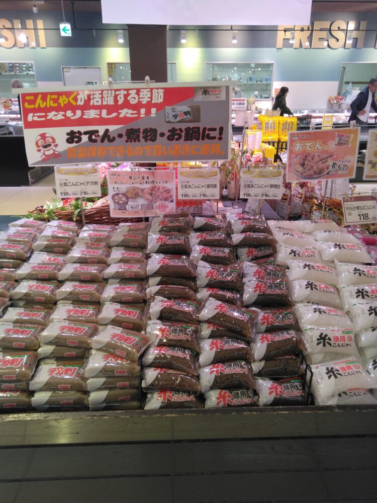 こんにちは、春日店日配です。今日のおすすめは、マルキンこんにゃく各種です。大容量だからおでんや煮物にたくさん使えます!買い置きにも便利!是非お買い求めくださいませ。